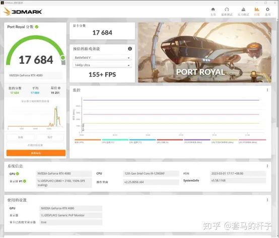 因为RTX4080基本是主打4K游戏为主了,这次的理论测试我们也直接上Fire Strike Ultra、Time Spy Extreme和光追性能Port Royal三个项目的成绩,可以看到得分分别为13841分、17057分和17684分,相比前代旗舰RTX3090Ti基本都高了20%以上,猛是真的猛,而且这两发布时间相差才几个月,被背刺的3090Ti玩家怕是有点不开心。