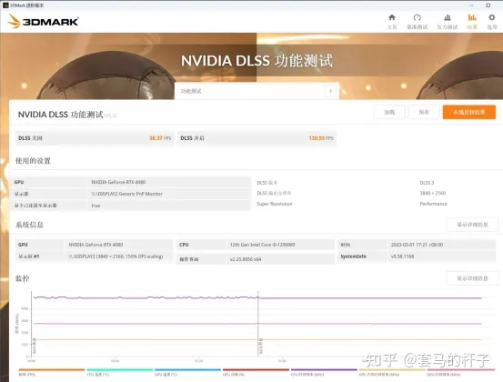 另外RTX4080还有DLSS3项目的测试,关闭DLSS3为38帧的情况下,开启之后可以飙升到130帧,提升了约242%,帧数提升确实有点离谱,当然具体还是要看在游戏中的表现,不过开光追的压力应该会小很多。