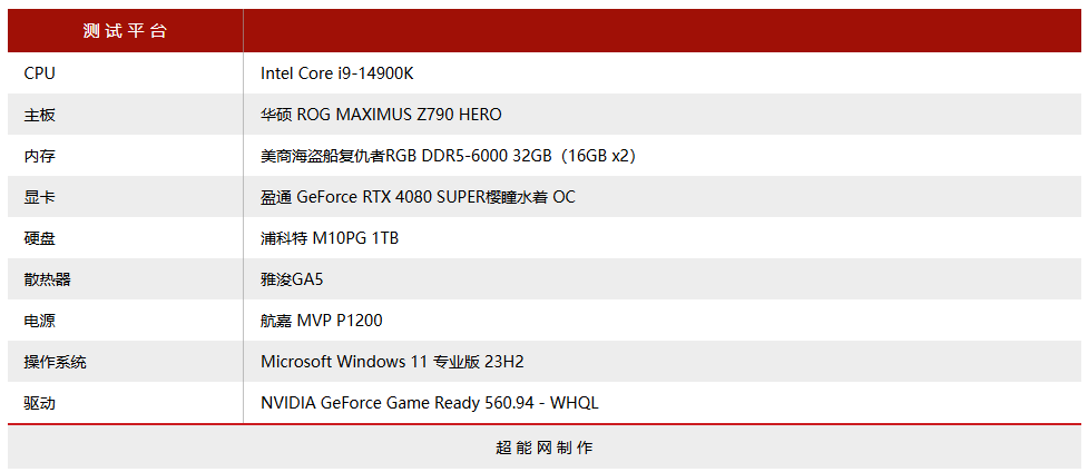 测试平台方面是选用了 Intel 的 i9-14900K 加 Z790 主板的组合,BIOS 开启了 Intel Default Settings,最新版的显卡驱动也打上了,其余的硬件大家可以看一下下方的配置表。