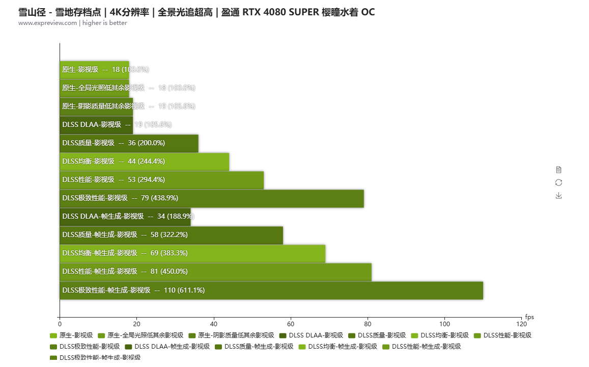 第二回合我们转到竹林,在这里不仅可以观察到阳光照射竹林中那种一明一暗的变化,而且还有流水和火光的场景,性能需求相比雪地要高上一些,因此,同样是在4K+光追超高画质下,原生影视级的帧数只剩下14帧了,晋级选手们的表现也受到了影响,证明了不开帧生成是不行的。同时,中挡光追由于BUG原因,火光的倒影无法正常显示,对于我们目前的筛选标准来说属于是扣大分的地方了,反倒是低挡位没事。