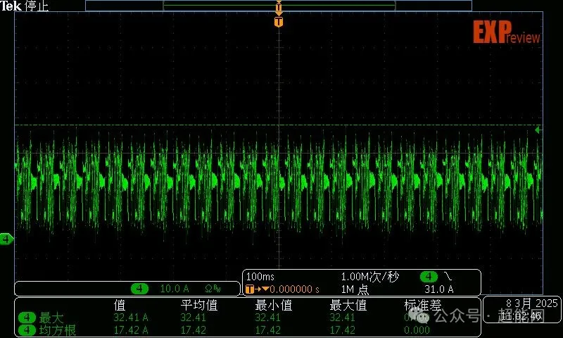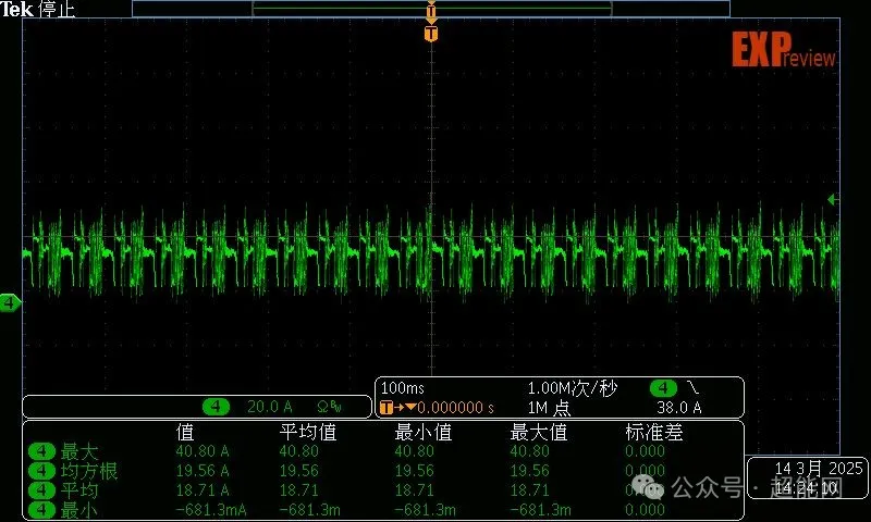 这次新增了展示显卡μs级瞬时功率的环节。在这里我们会使用泰克MDO3054示波器与TCPA400 + TCP404XL电流探头的配合测量显卡的外接供电输入来看显卡μs级的瞬时功率。和大部分显卡一样,RX 9070樱瞳水着Atlantis OC主要通过外接供电接口取电,PCIe插槽的功耗仅在15W上下。