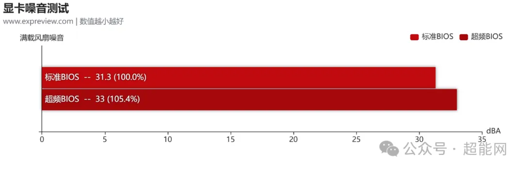 在GPU-Z的Log to File中我们同时记录下了显卡转速情况。RX 9070樱瞳水着Atlantis OC的两个BIOS在满载时的风扇转速很难称得上有区别,标准BIOS是25%,约1060RPM,超频BIOS则是27%,约1130RPM。因此在噪音这块也拉不开差距,一个是31.1dBA,另一个是33dBA。我猜实际使用时应该没有谁的耳朵那么灵敏能听出它们的不同。