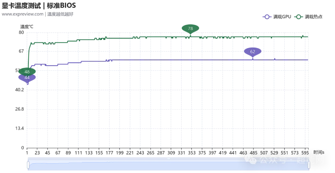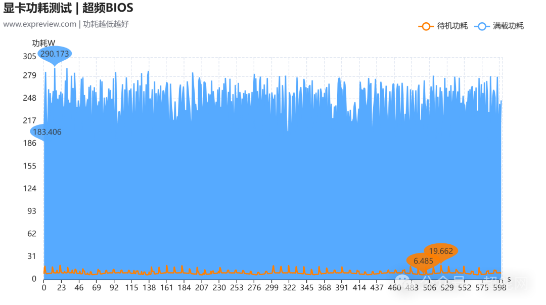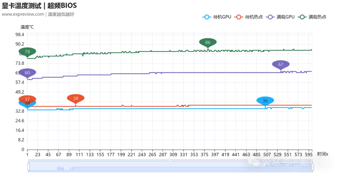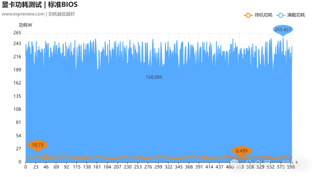 先来看超频BIOS时的情况,可看到满载时GPU的温度为66摄氏度,热点温度则为85摄氏度;而标准BIOS下,满载GPU温度有所降低,来到了61摄氏度,热点温度则是77摄氏度。可以说两个BIOS的差距还挺明显的,但是老实说就算是超频BIOS,这个满载GPU温度也很难说得上热。至于待机时的温度表现,这里就只放超频BIOS的情况了。毕竟从闲置频率上来说两个BIOS真没什么区别,都是个位数。加上风扇此时并不会启动,环境温度造成的影响会更大一些。