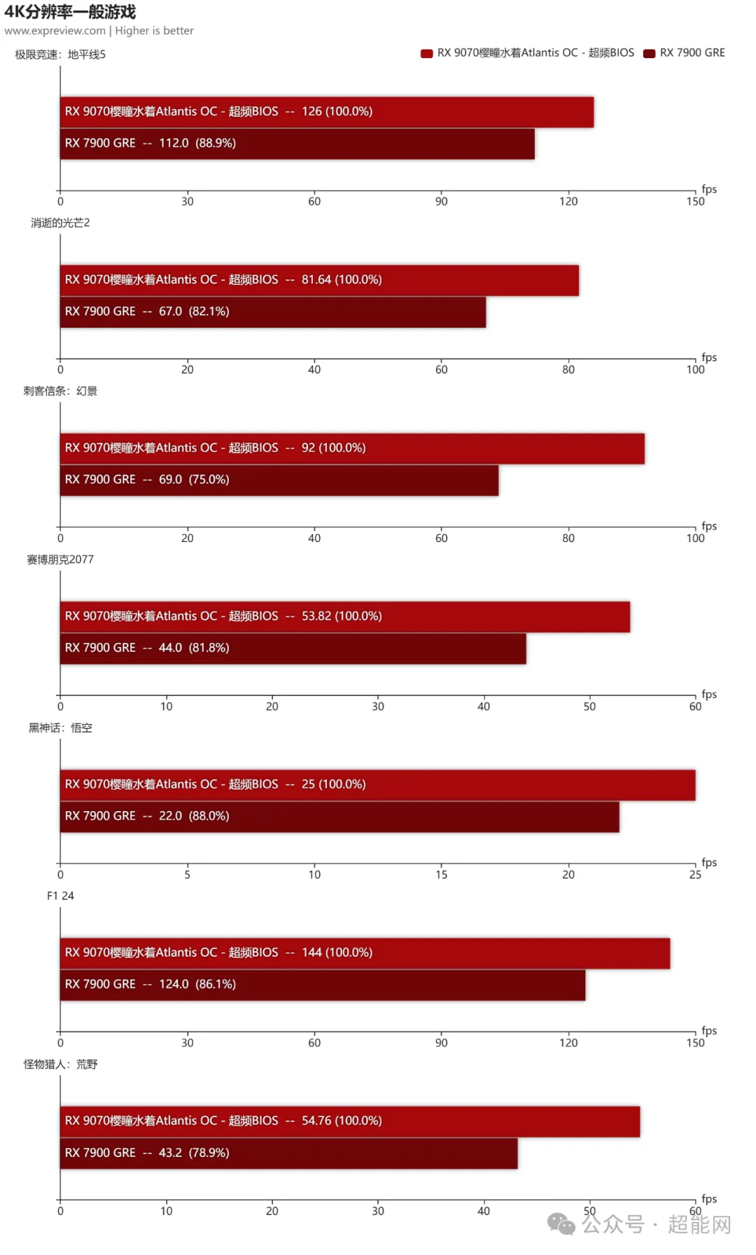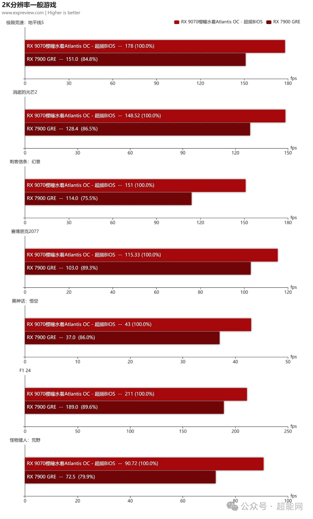 在4K分辨率测试里面,我们能看到RX 9070樱瞳水着Atlantis OC比起RX 7900 GRE要快上不少,像《消逝的光芒2》和《刺客信条:幻景》这些在RX 7900 GRE上仅达到流畅级别的游戏,RX 9070樱瞳水着Atlantis OC能够让它们的帧率提升到新层次。同时《赛博朋克2077》和《怪物猎人:荒野》在樱瞳水着上也很接近60fps了,算是开个FSR 3质量挡就能玩的级别。平均下来,RX 9070樱瞳水着Atlantis OC要比RX 7900 GRE好上21%。