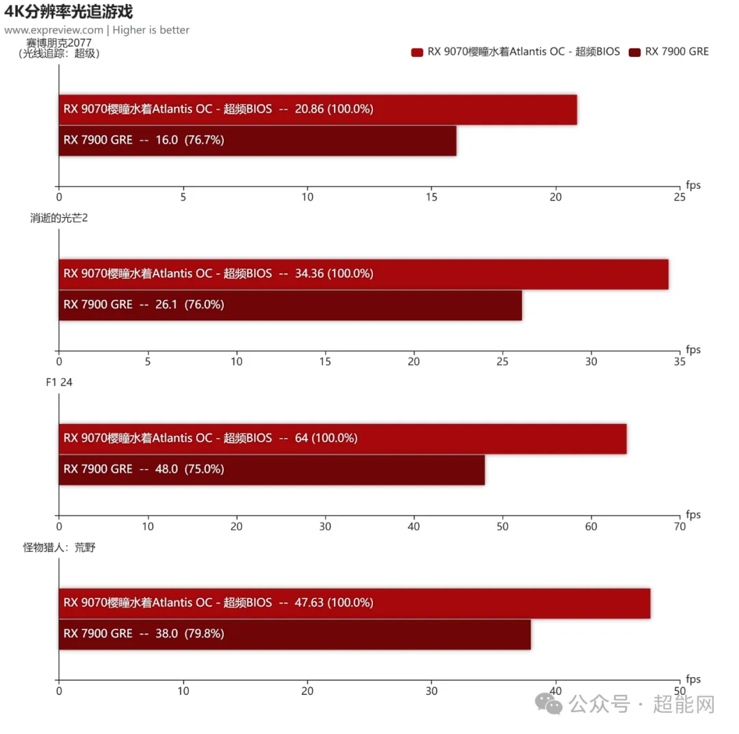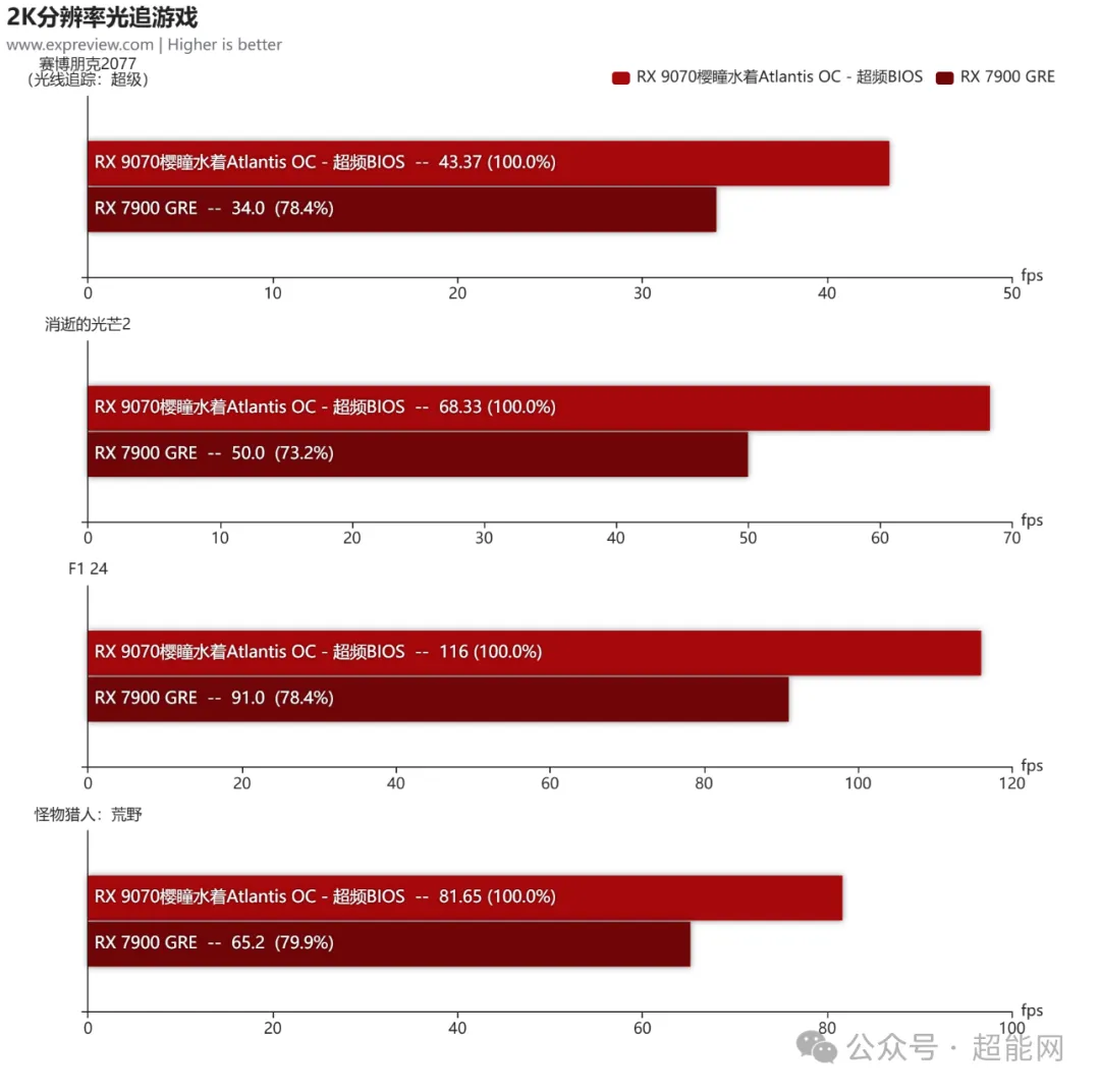 光追性能的提升同样是RDNA 4架构的提升重点,算下来RX 9070樱瞳水着Atlantis OC要比RX 7900 GRE平均好30%!当然,就具体帧率而言,FSR这类技术对于光追游戏来说还是必不可少的。