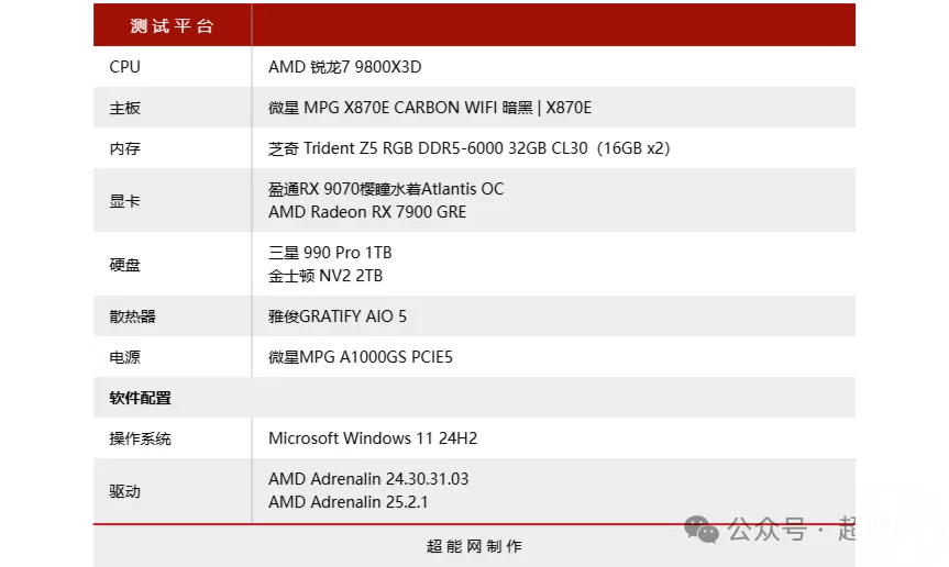 我想应该大伙对于这套测试平台应该相当熟悉了。值得一提的是,这次组的不仅是真3A平台,还是双9000主机。由于盈通RX 9070樱瞳水着Atlantis OC提供了双BIOS可选,下面的测试将主要在超频BIOS的环境下进行,当然也有一小部分测试是两个BIOS都会跑的。