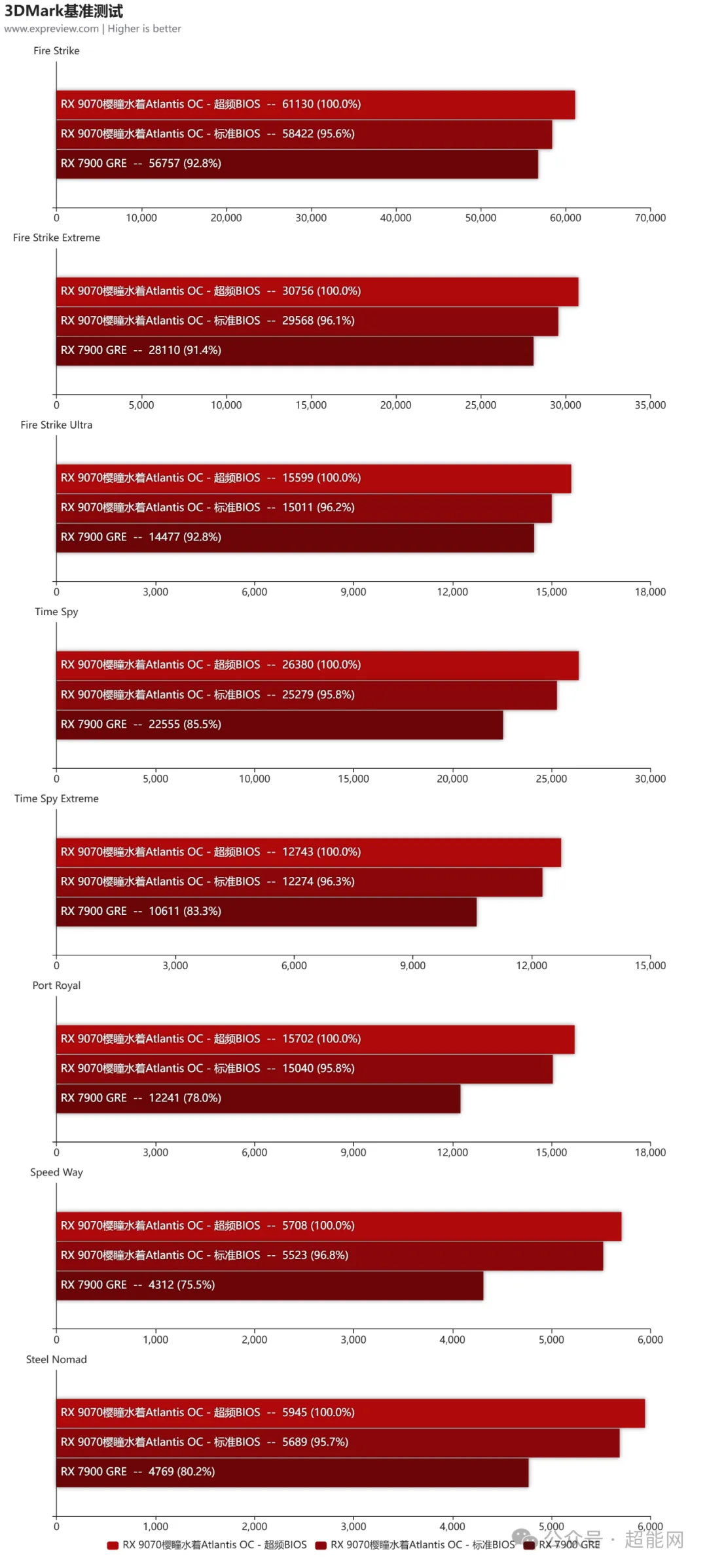 在3DMark基准测试中,RX 9070樱瞳水着Atlantis OC的两个BIOS差距平均下来在4%左右,可以说这超频BIOS带来的提升幅度还是挺大的。和RX 7900 GRE对比的话,RX 9070樱瞳水着Atlantis OC(超频BIOS)主要是在DX 12系列测试Time Spy和光追测试中拥有着非常明显的优势。特别是Port Royal和Speed Way两个光追测试,RX 9070樱瞳水着Atlantis OC平均下来要比RX 7900 GRE快近40%!