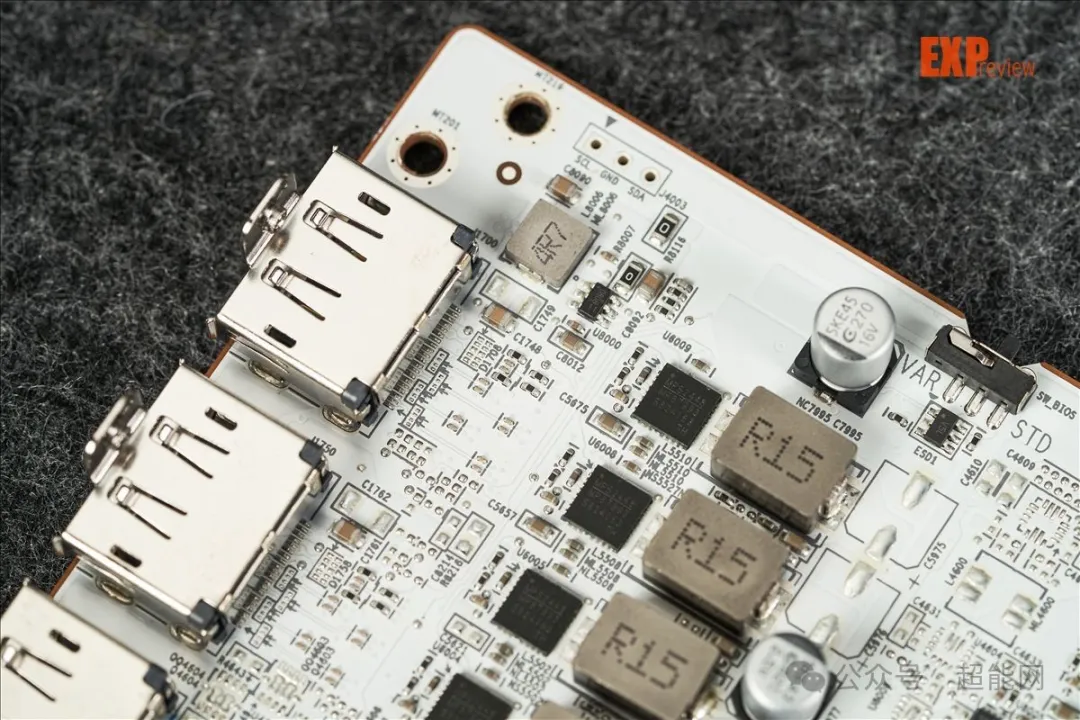 再来看上面两个开关,丝印为SW_BIOS的开关是控制BIOS的,默认打在STD的位置,也就是公版频率,VAR就是超频BIOS。SW_LED是灯效开关,默认是打开的。