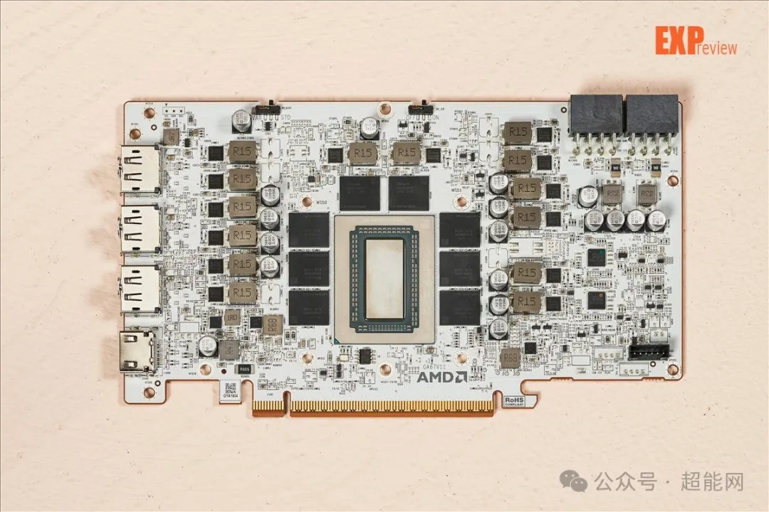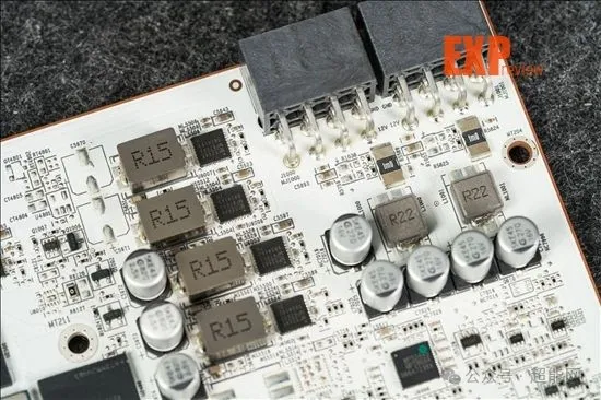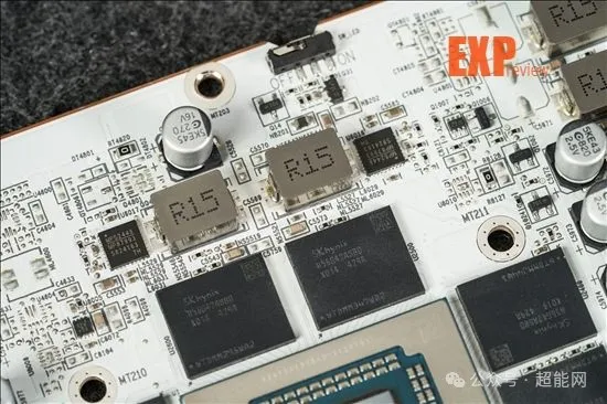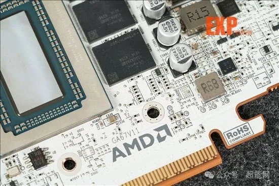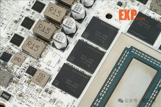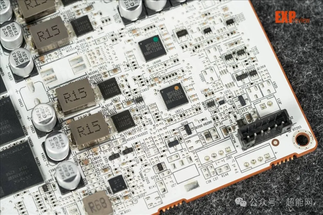 核心和显存供电PWM均是来自MPS的MP2868A,这颗IC太新了,没什么资料。供电数下来总共是14相,估计应该是10 + 4的分配。所用的MOSFET均是MPS MP87993 DrMOS——这点红队和绿队倒是做出了同样的选择。