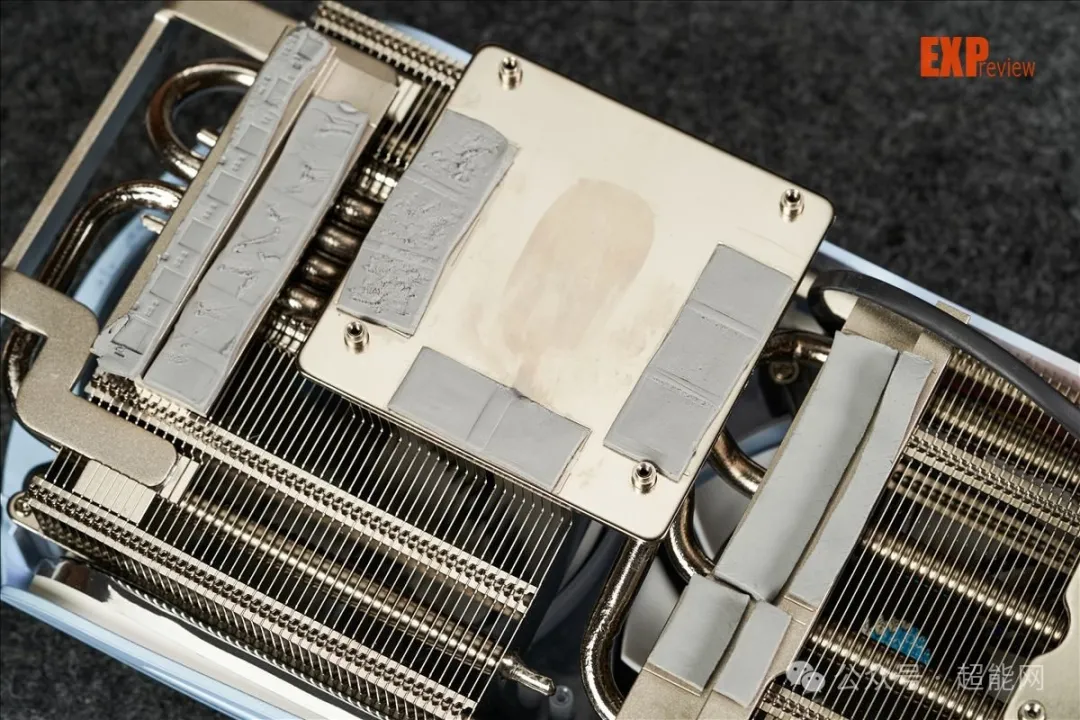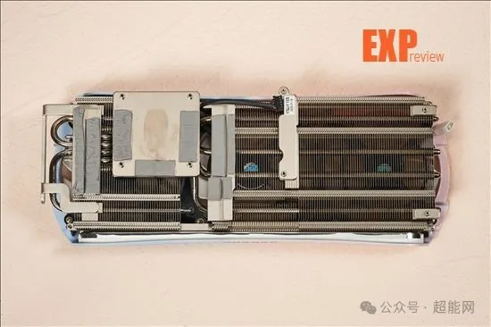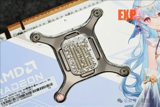 跟以前一样,我们先来看散热模块。盈通RX 9070樱瞳水着Atlantis OC使用的是铜底座加4根6mm热管的配置。和之前的型号一样,樱瞳水着Atlantis也拥有香氛模块,虽然从图片里面是看不太到它的确切位置,但是个人估计应该也是在导风罩内侧的某处。由于主题来到了亚特兰蒂斯,因此盈通这次也把香氛的主题更换成海洋系的,不过bro我并不是评测界的阿尔·帕西诺,倒是没办法说出这香味比较阿库娅还是更为芙宁娜,总之挺香就是了。