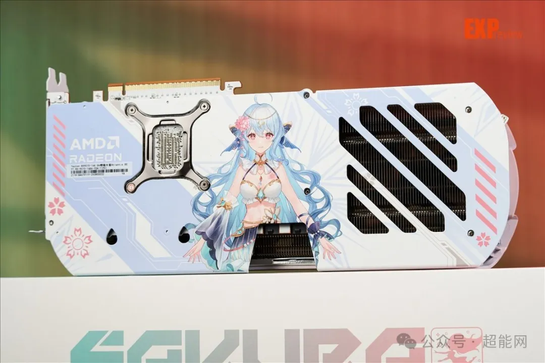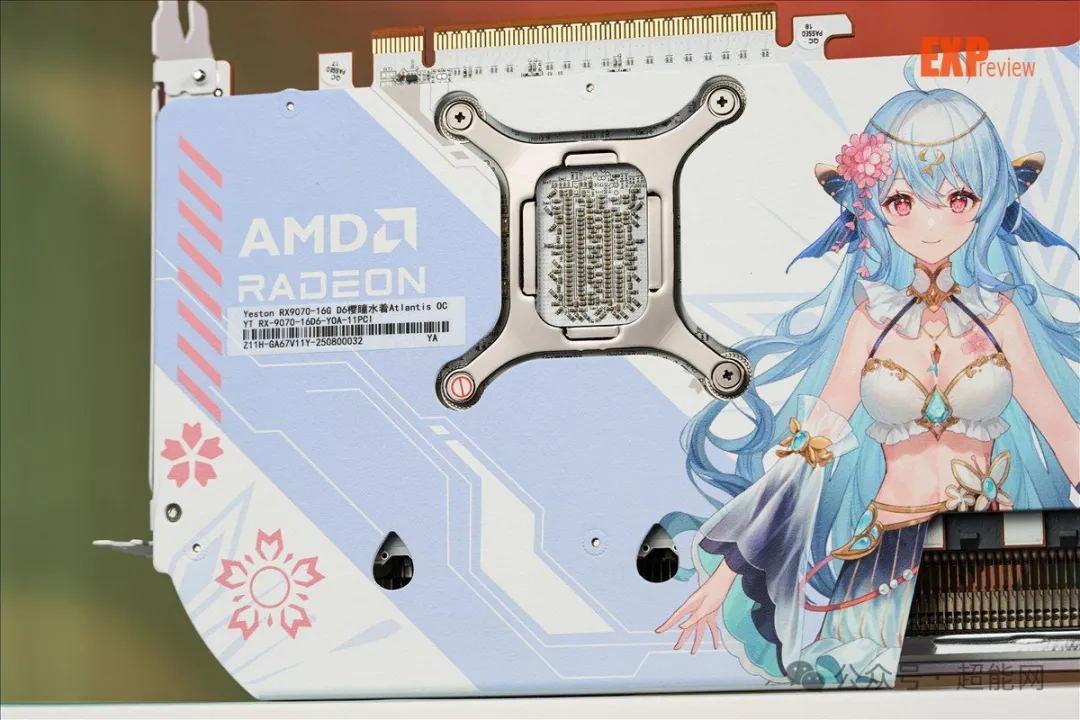 接下来再说说RX 9070樱瞳水着Atlantis OC这张卡本身。正如我在开头所说的那样,盈通这次没有继承上代设计,而是选择了新主题,为樱瞳小姐带来了全新装扮,这本身就是一个勇气和用心的体现。不管是流线型的导风罩、背板的水着立绘以及海洋系香氛,樱瞳水着这次辨识度依旧够高。因此,我也相信她这次依旧能击中二次元玩家们的心。