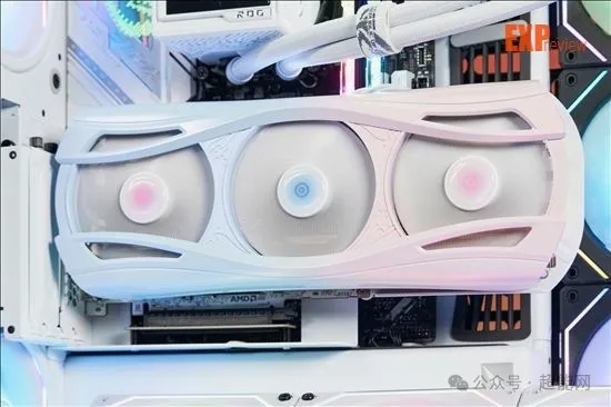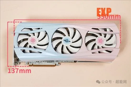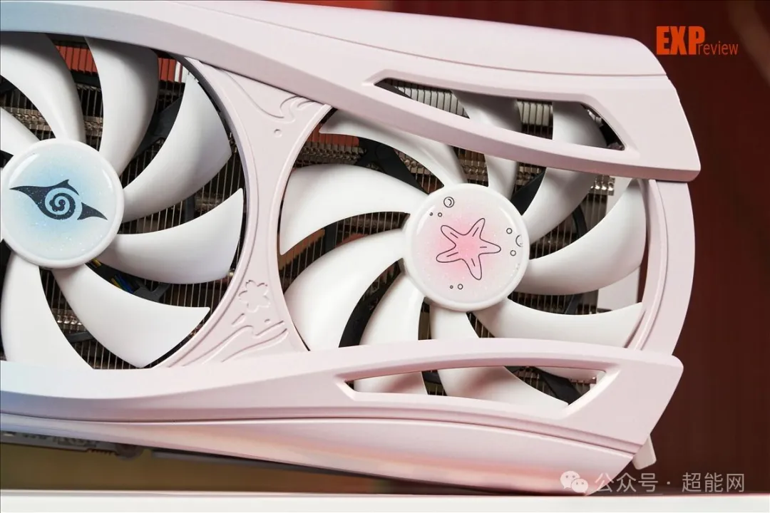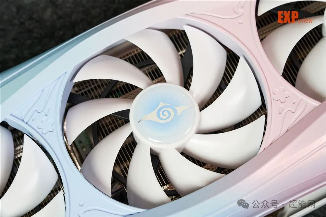 就尺寸来说,RX 9070樱瞳水着Atlantis OC是张算得上巨大的显卡。不过规模上巨大并不意味着细节上会有所折损,事实上,这张显卡的导风罩漆面相当精致,蓝粉两种颜色过渡十分自然之余,表面也分外平滑均匀,同时附带一层闪粉效果。得益于变色龙油漆的使用和多次喷涂,导风罩表现出来的质感让你很难把它和塑料联系在一起,尽管它的材质确实是塑料。