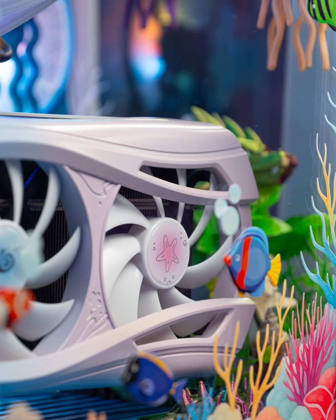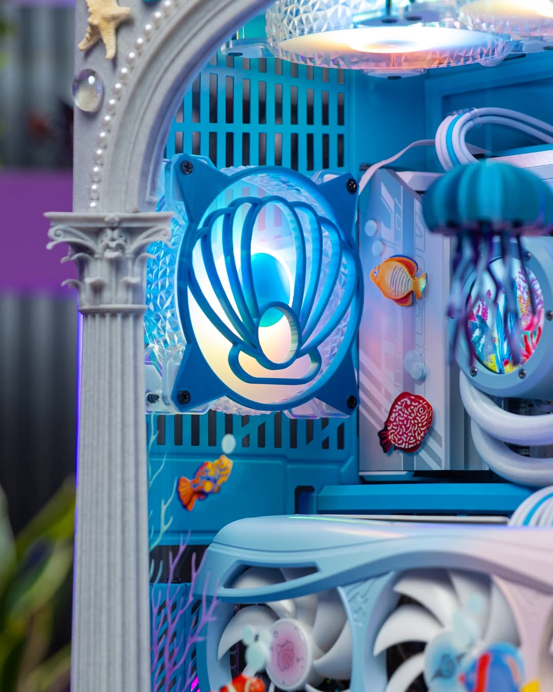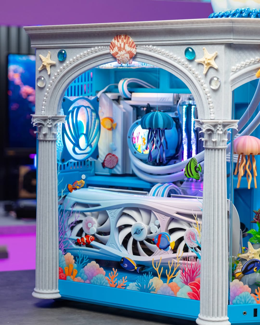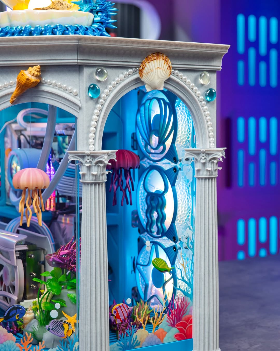 “樱瞳宫殿”火遍TIKTOK!机箱外观融合罗马立柱的造型,整机点缀着珊瑚礁、水母等海洋生物,营造出置身亚特兰蒂斯沉没之城的秘境氛围。