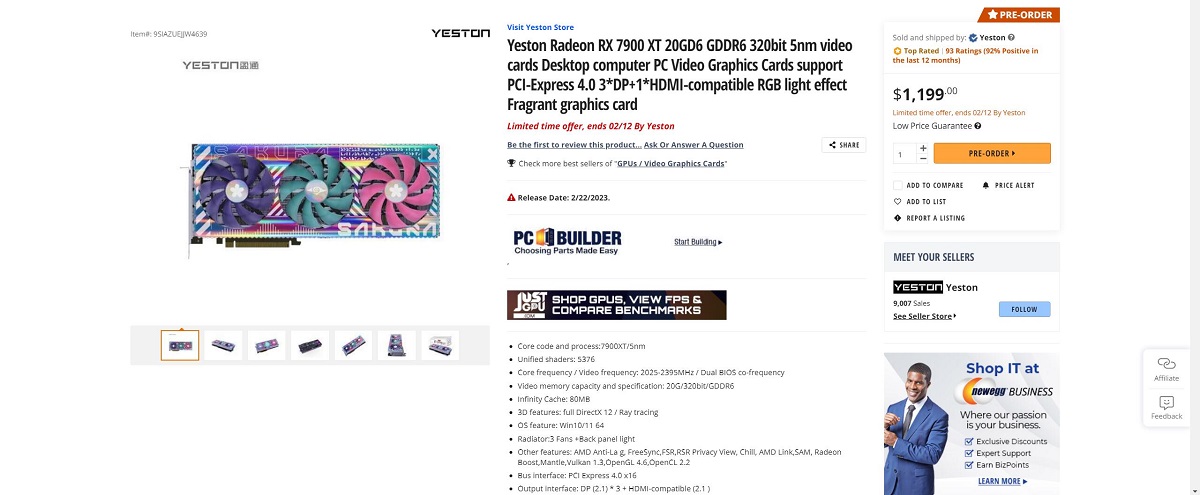 盈通的Radeon RX 7900XT樱瞳水着显卡将在2023年2月22日于美国的Newegg电商平台开售,其中盈通RX 7900 XT樱瞳水着的价格为1199美元,相比公版Radeon RX 7900XT高出300美元,而盈通的RX 7900 XTX尚未上架Newegg。