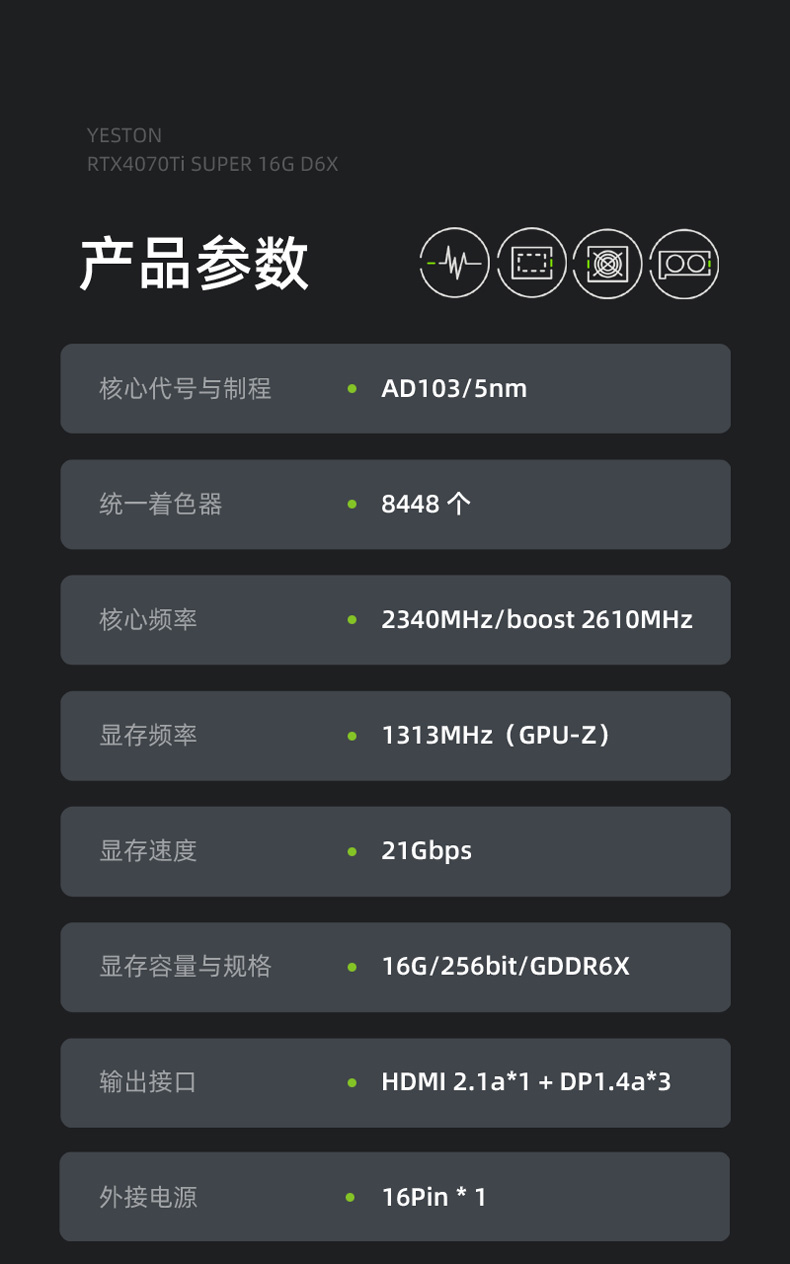 核心代号与制程: RTX 4070 Ti SUPER/5nm统一着色器:8448 个核心频率:2340MHz/boost 2610MHz显存频率:1313MHz(GPU-Z)显存速度: 21Gbps显存容量与规格:16G/256bit/GDDR6X3D 特性:DirectX 12/Ray Tracing/ Tensor/G-Sync /DLSS/ REFLEX/BROADCAST/ANSEL/VRREADY/Vulkan1.3/ RT APIs/ OpenGL 4.6/HDCP 2.3/AV1 编解码OS 特性:WIN10/WIN11/LINUX(64 位)