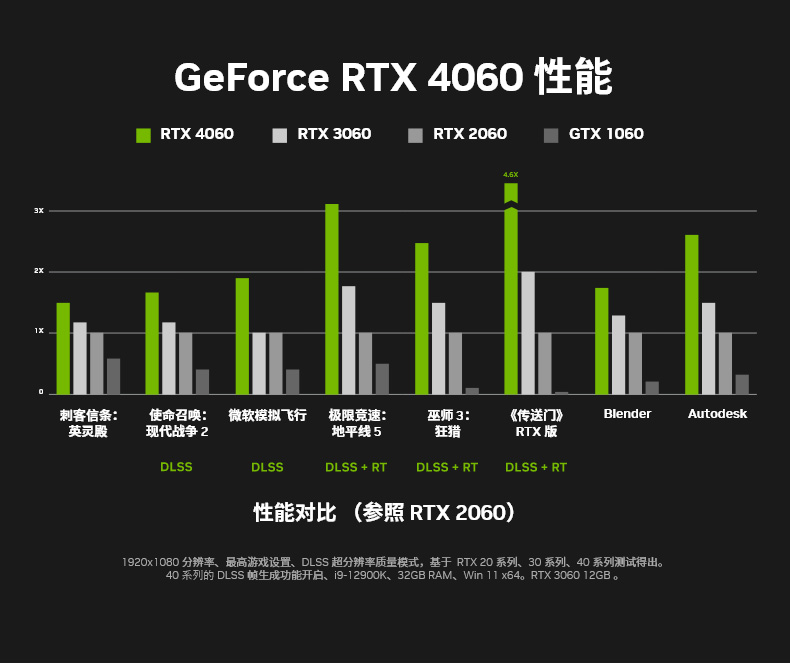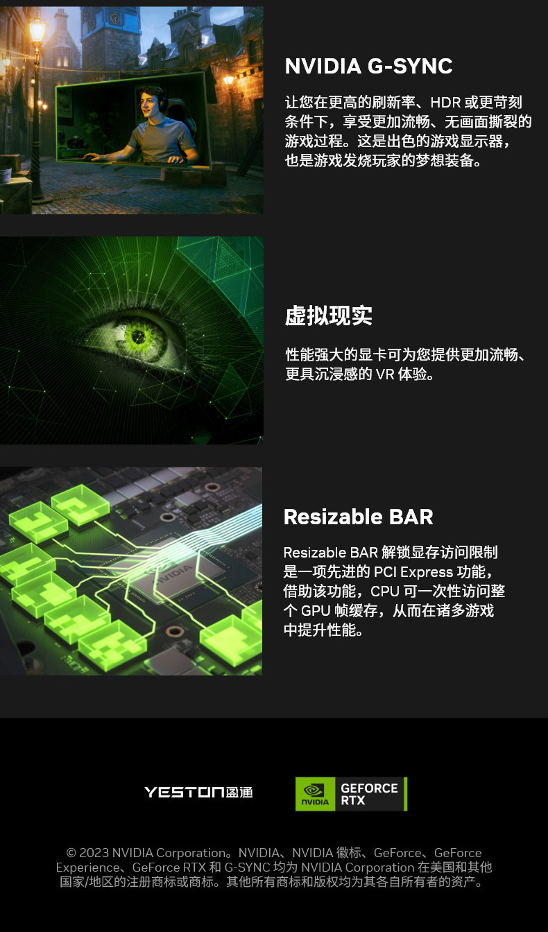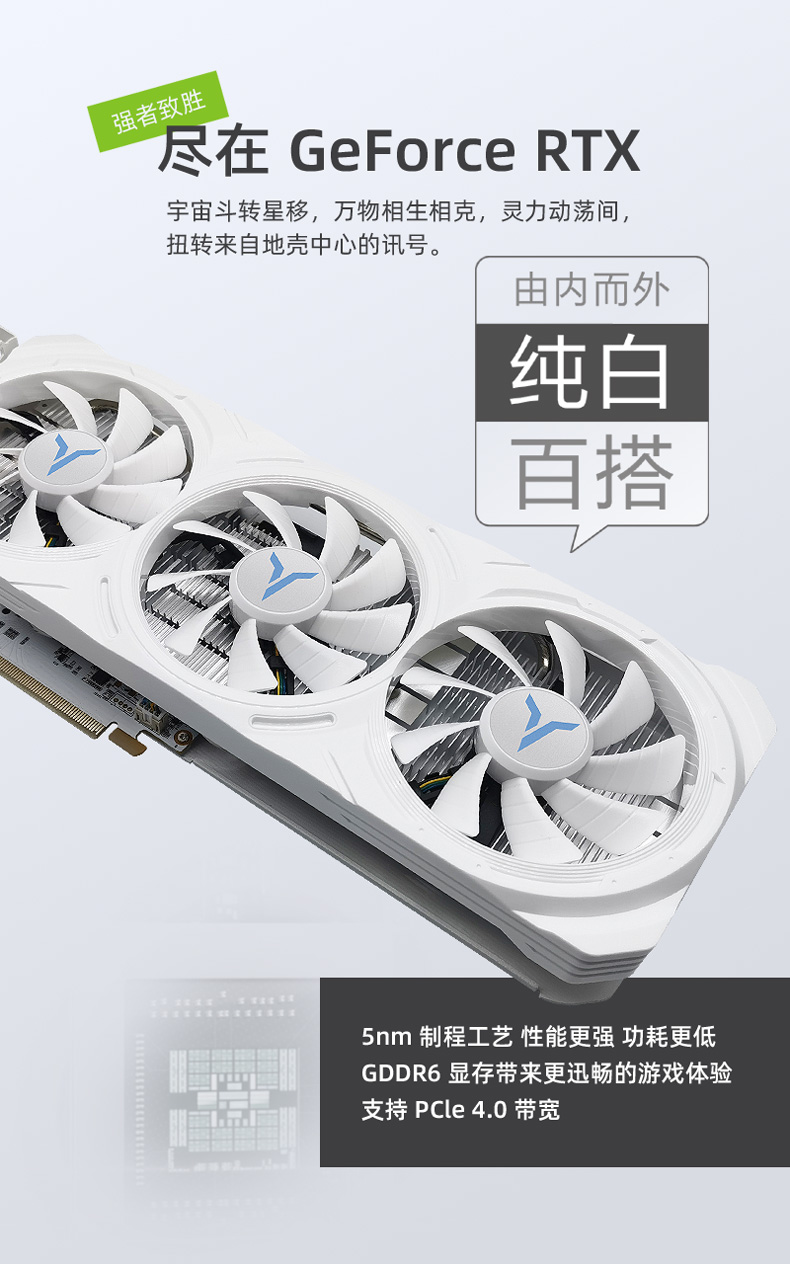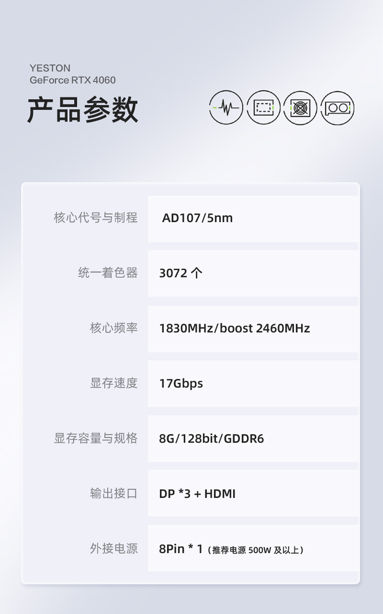 核心代号与制程: RTX 4060/5nm统一着色器:3072 个核心频率:1830MHz/boost 2460MHz显存频率:2125MHz显存速度: 17Gbps显存容量与规格:8G/128bit/GDDR63D 特性:DirectX 12/Ray Tracing/ Tensor/G-Sync /DLSS3/ REFLEX/BROADCAST/ANSEL/VRREADY/Vulkan1.3/ RT APIs/ OpenGL 4.6/HDCP 2.3/CUDA8.9OS 特性:WIN10/WIN11/LINUX(64 位)散热器:YT2D-T(8.6CM *3 风扇,6mm*2 热管)