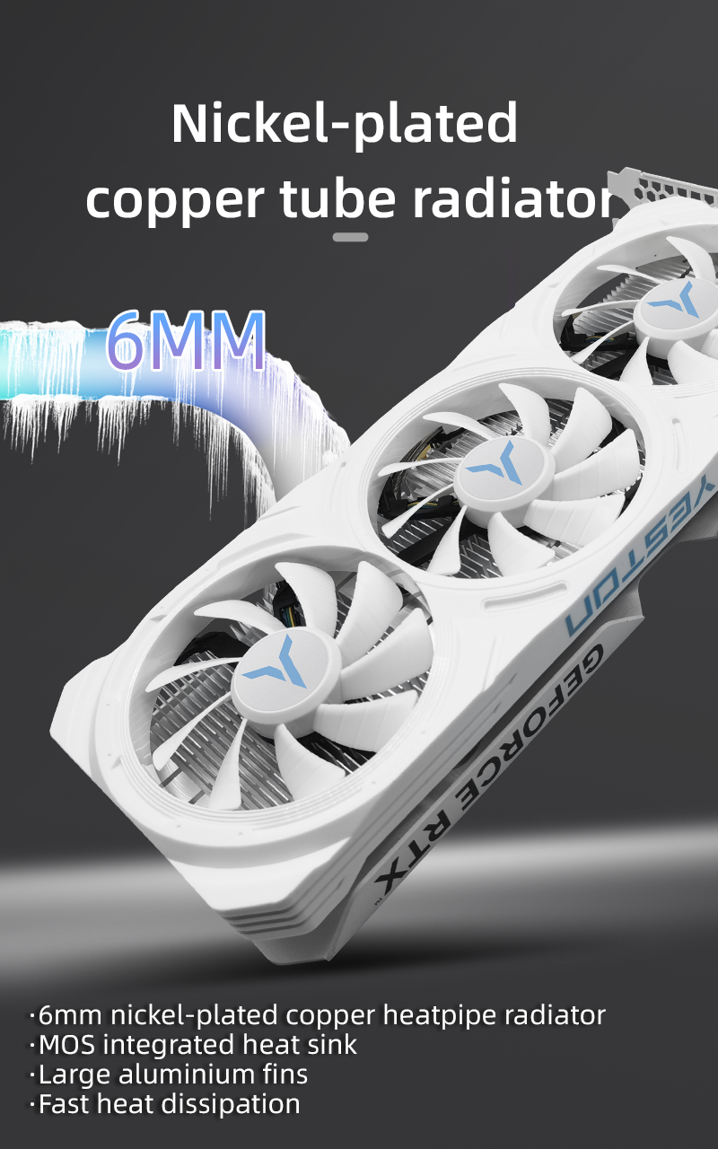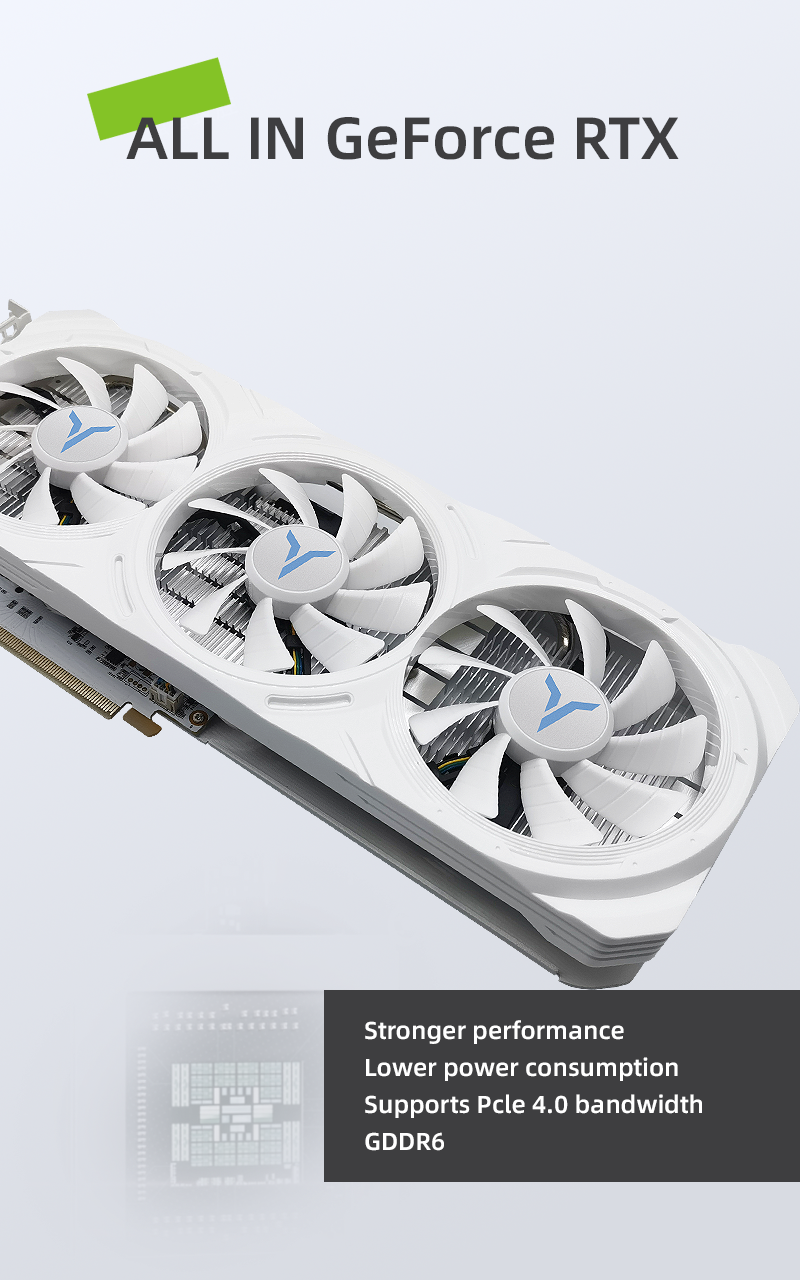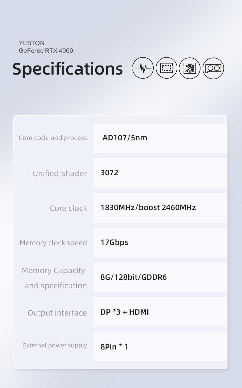 Core code and process: AD107/5nmUnified shaders: 3072Core frequency: 1830MHz/boost 2460MHzMemory frequency: 2125MHzMemory speed: 17GbpsVideo memory capacity and specifications: 8G/128bit/GDDR63D features: DirectX 12/Ray Tracing/ Tensor/G-Sync /DLSS3/ REFLEX/BROADCAST/ANSEL/VRREADY/Vulkan1.3/ RT APIS/ OpenGL 4.6/HDCP 2.3/CUDA8.9OS features: WIN10/WIN11/LINUX (64-bit)Radiator: YT2D-T (8.6CM*3 fan 6mm*2 heat pipe)
