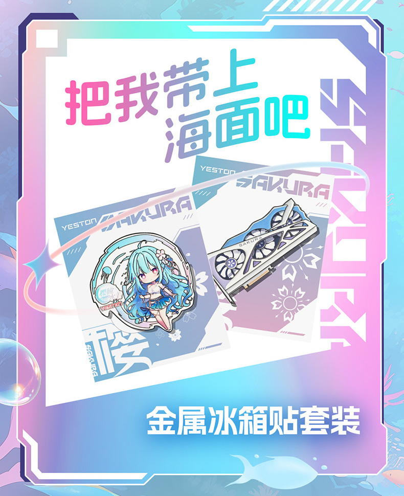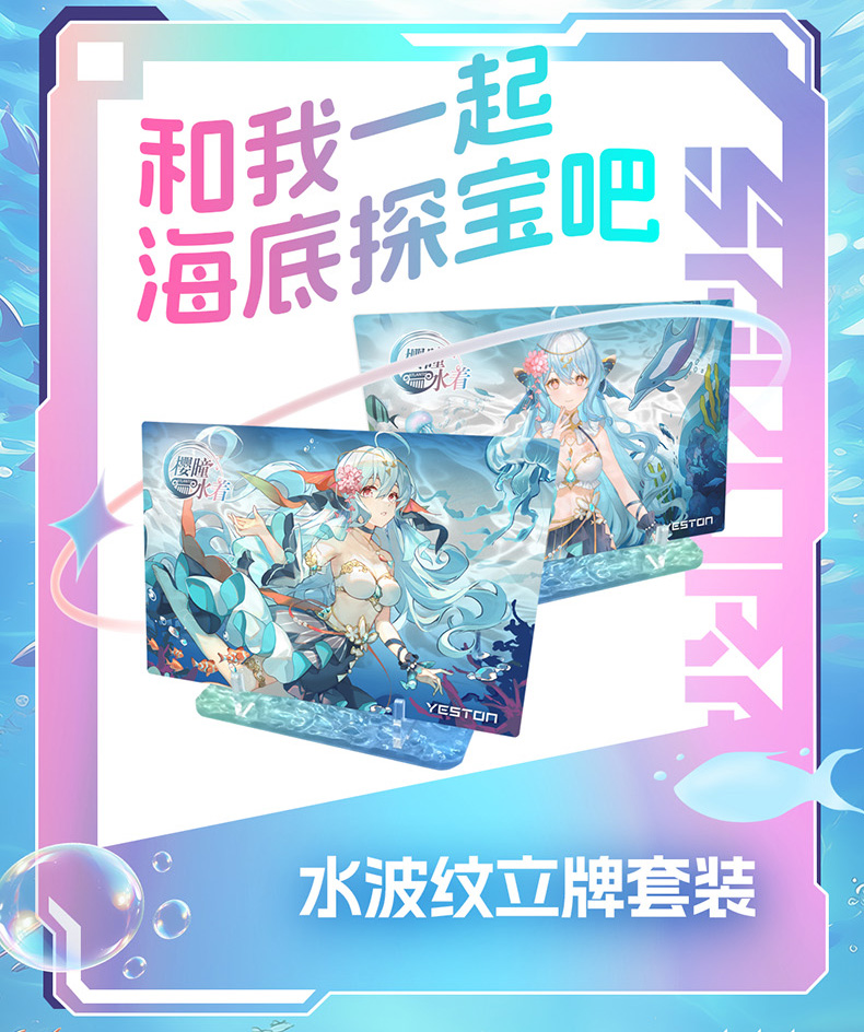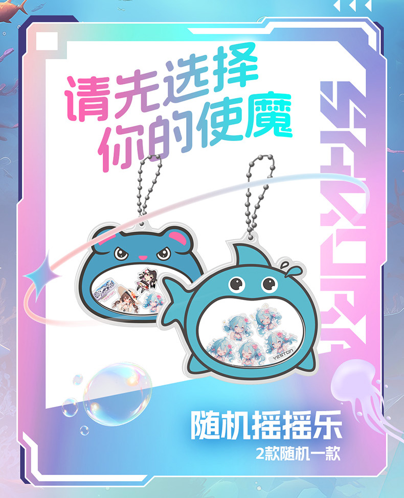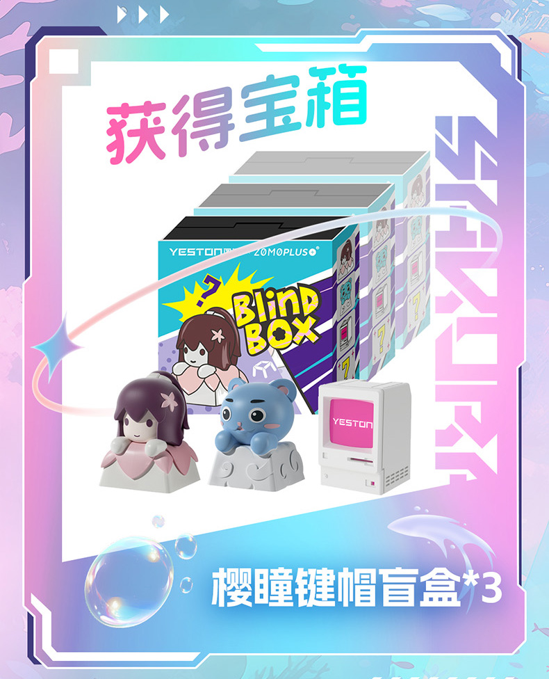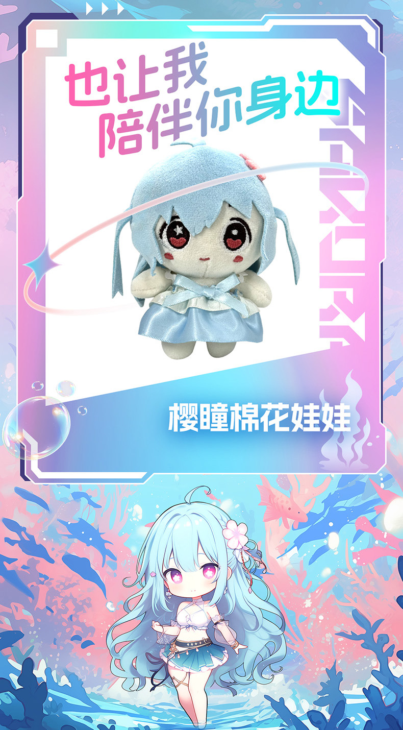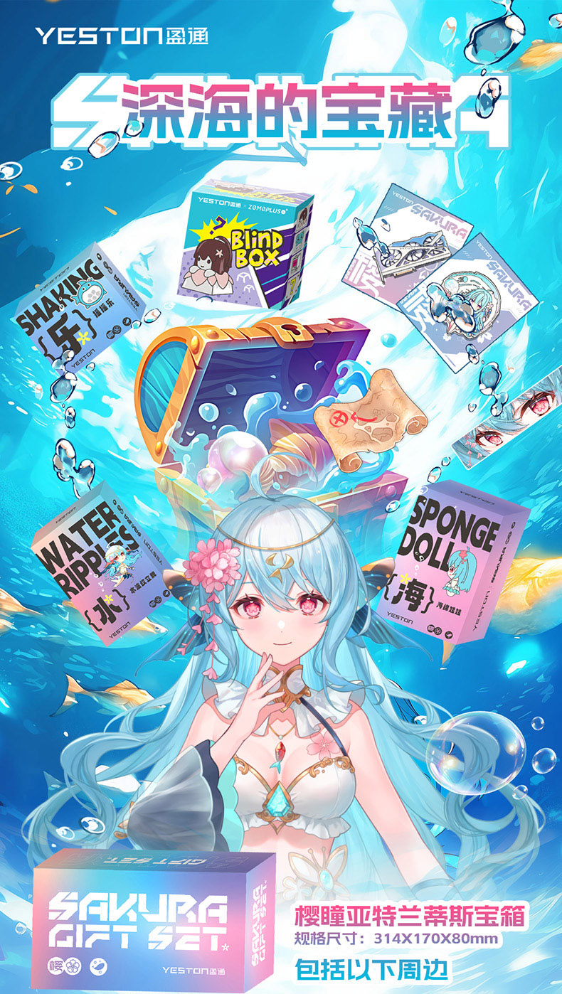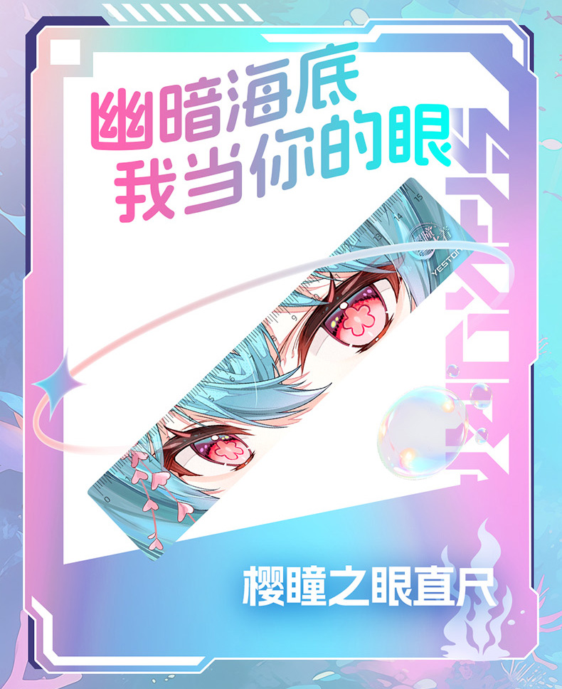 内含:水波纹立牌套装、随机摇摇乐、樱瞳之眼直尺、樱瞳键帽盲盒*3、金属冰箱贴套装、樱瞳棉花娃娃