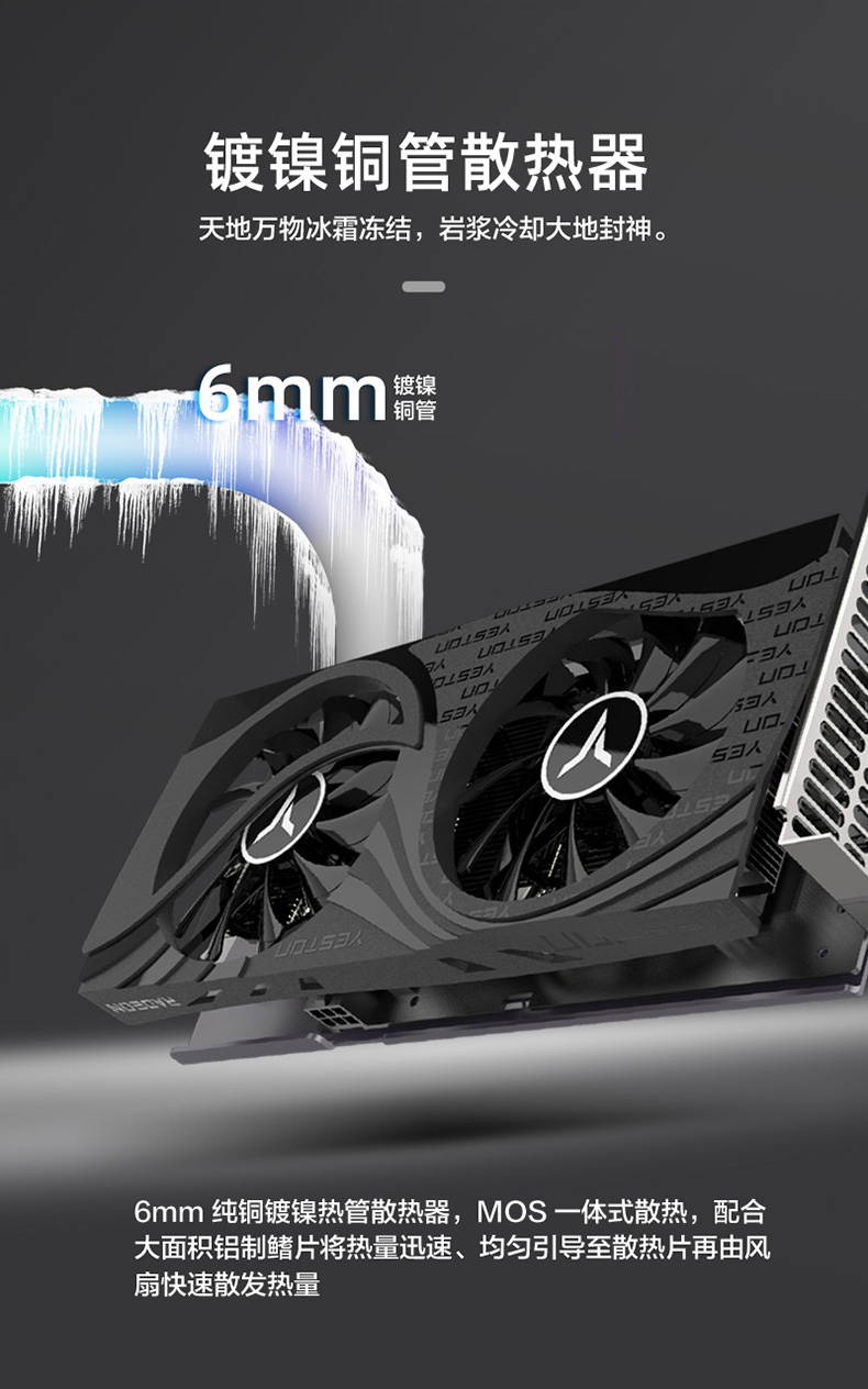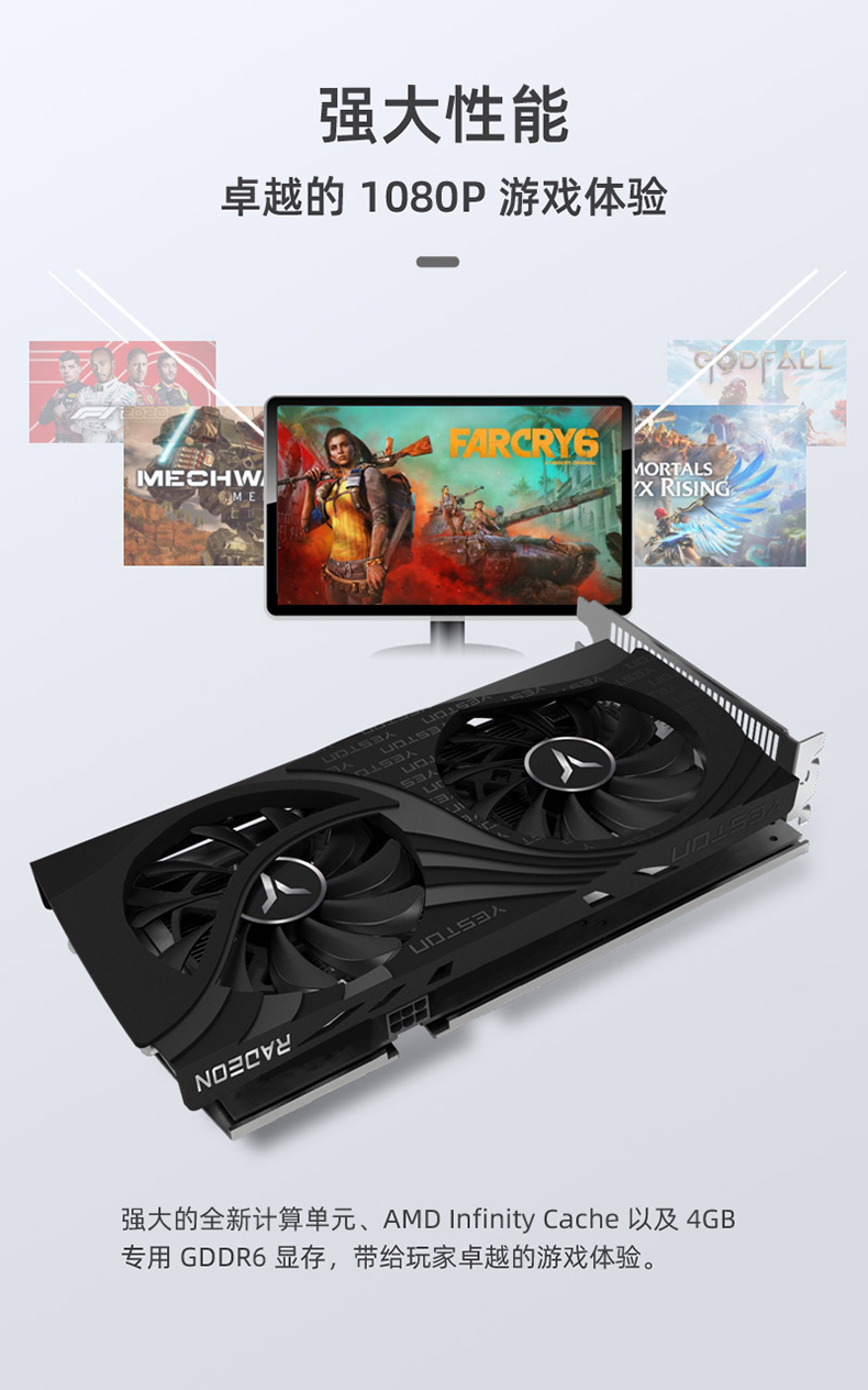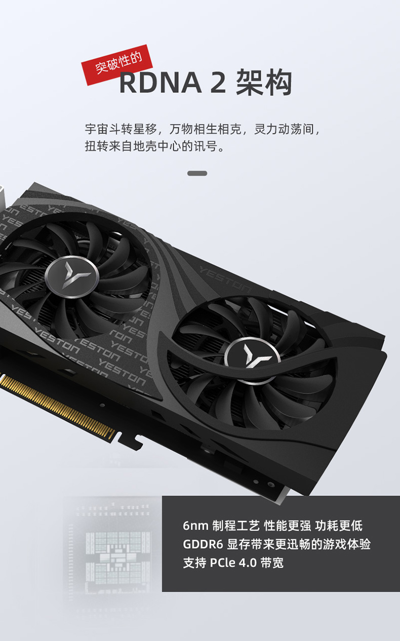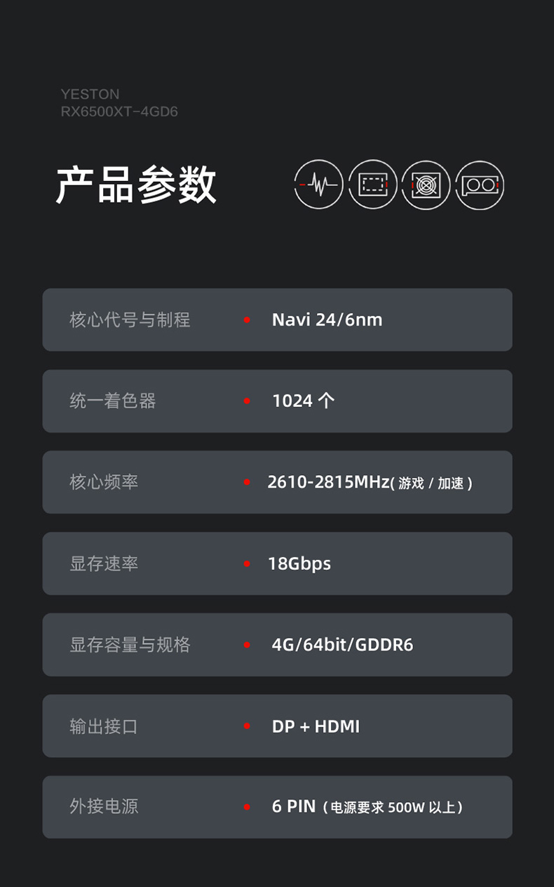 核心代号与制程: Navi 24/6nm 统一着色器:1024 个核心频率: 2610-2815MHz (游戏/加速) 显存速度:2248Mhz 显存速度: 18Gbps 显存容量与规格:4G/64bit/GDDR6 散热器: YX1B-Q2(双风扇 热管 6mm*1 y) 风扇特性:4pin、可调速、可显示转速 总线接口:PCI-Express 4.0 x4 输出接口:DP(1.4a) + HDMI(2.1 VRR and FRL) 最大分辨率:7680*4320(DP) 供电设计:5+2 相 外接电源:6 PINÿ电源要求 500W 以上Ā显卡尺寸/重量: 240*110*42mm/489g