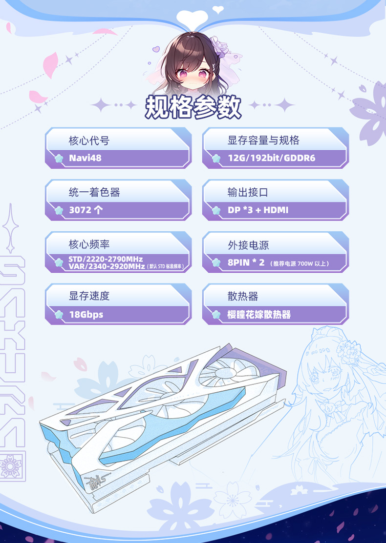 核心代号与制程:Navi48/4nm统一着色器:3072 个核心频率: STD/2200-2790MHz,VAR/2340-2920MHz(默认 STD 标准频率)BIOS: 双 bios 开关(STD/VAR)显存频率:2250MHz显存速度: 18Gbps显存容量与规格:12G/192bit/GDDR6散热器:4*6mm 复合热管,9.1cm *3 双滚珠风扇,纯铜底,顶部灯带支持 ARGB 灯光同步输出接口:DP(2.1) *3 + HDMI(2.1a)最大分辨率:7680*4320(DP & HDMI)外接电源:8PIN * 2(推荐电源 700W 以上)显卡尺寸: 326*136*68mm (不含挡片)330*136*68mm (含挡片)