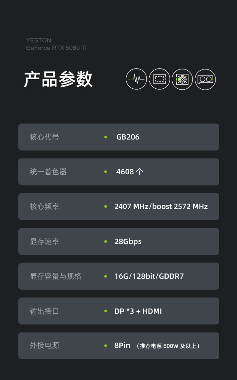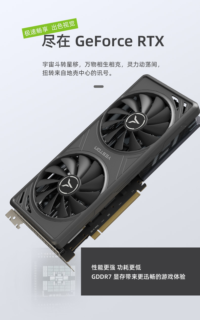 核心代号: GB206统一着色器:4608 个核心频率:2407 MHz/boost 2572 MHz显存频率:1750 MHz显存速度: 28GbpsAI TOPS: 759显存容量与规格:16G/128bit/GDDR7散热器:2*9.6cm 风扇、4*6mm 热管输出接口: HDMI (2.1b*1) + DP (2.1b*3)总线接口:PCI-Express 5.0 x8供电设计:5 NVVDD + 2 FBVDD外接电源:8 Pin显卡功率/推荐电源: 约 180W/ATX 3.0 规范 600W 及以上显卡尺寸/重量:266*123*38mm/790g(不含挡片耳朵)显卡最大尺寸:281*138*38 (含挡片)