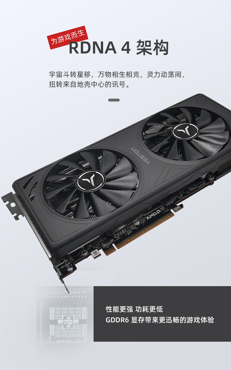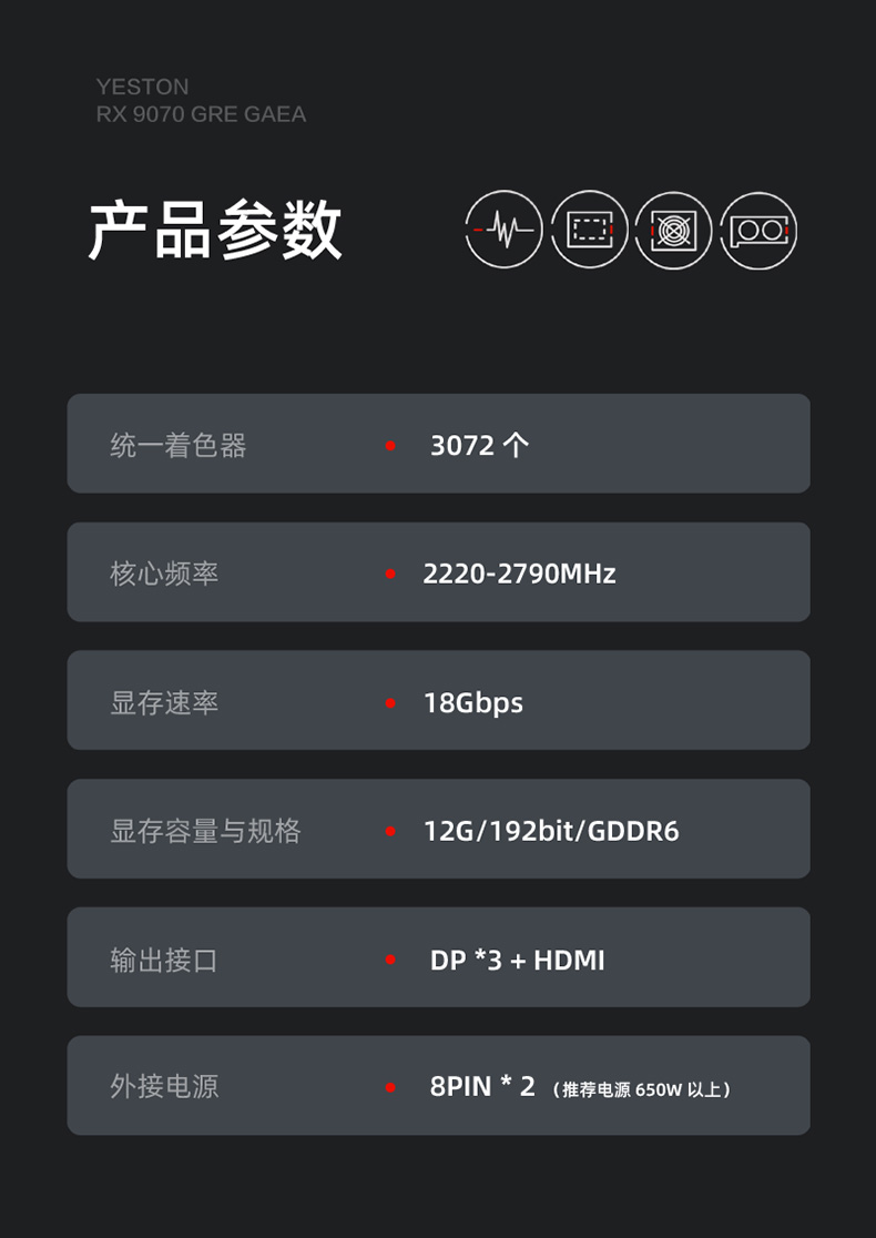 核心代号与制程:Navi48/4nm统一着色器:3072 个核心频率: 2220-2790MHz显存频率:2250MHz显存速度: 18Gbps显存容量与规格:12G/192bit/GDDR6散热器: 5*6mm 复合热管,9.6cm* 2 滚珠风扇总线接口:PCI-Express 5.0 x16输出接口:DP(2.1a) *3 + HDMI(2.1b)供电设计:9+3 相外接电源:8PIN * 2(推荐电源 650W 以上)显卡尺寸/重量:268*123*40mm/891g显卡最大尺寸:282*140*42mm