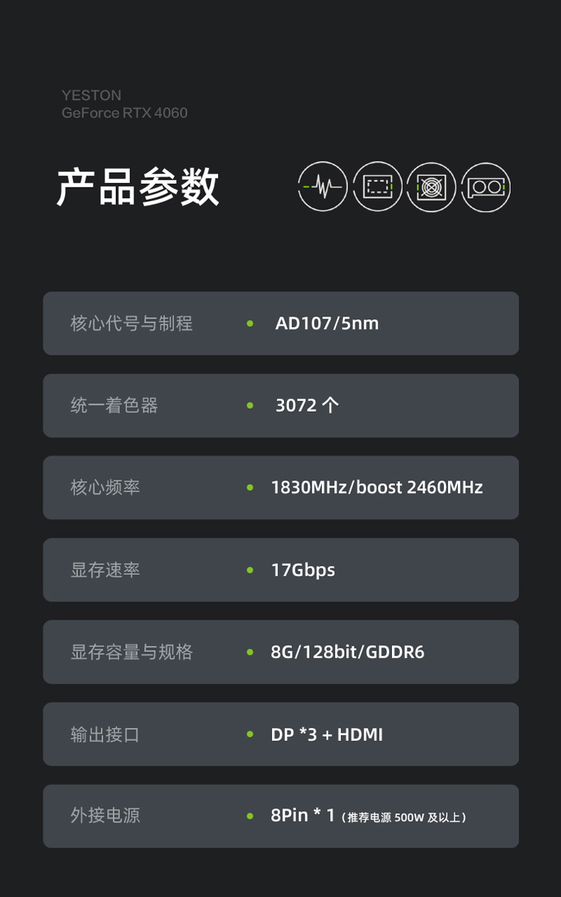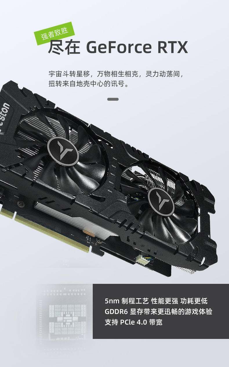 核心代号与制程: AD107统一着色器:3072 个核心频率:1830MHz/boost 2460MHz显存频率:2125MHz显存速度: 17Gbps显存容量与规格:8G/128bit/GDDR6散热器:8.6CM *2 风扇,6mm*4 热管总线接口:PCI-Express 4.0 x8输出接口: HDMI 2.1a*1 + DP1.4a*3供电设计: NVVDD 4,FBVDD 1外接电源:8Pin * 1显卡功率/推荐电源: 约 115W/ 500W 及以上显卡尺寸:243*113*43mm (不含挡片) 背板至风扇最长距离245*113*43mm (含挡片) 双槽占用