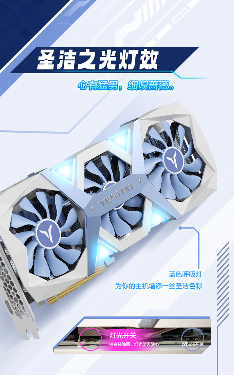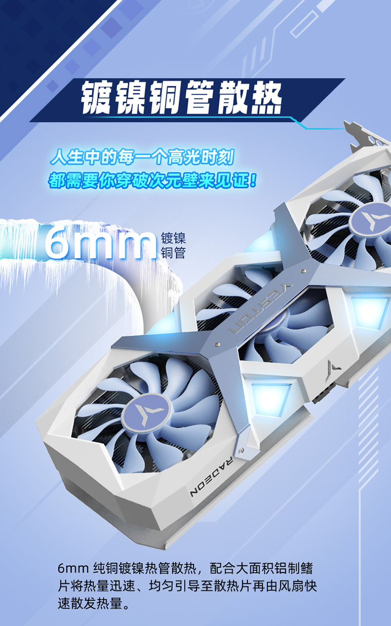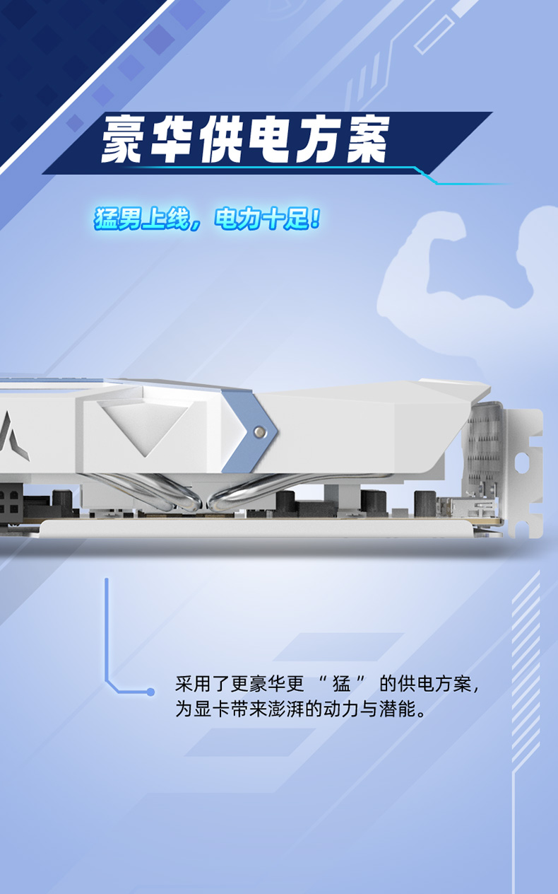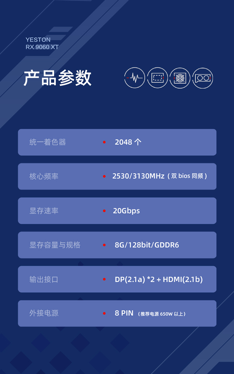 基本规格参数:核心代号:Navi48统一着色器:2048 个核心频率: 2530/3130MHz(双 bios 同频)显存频率:2518MHz显存速率: 20Gbps显存容量与规格:8G/128bit/GDDR6散热器:3*6mm 复合热管,8.7cm *3 单滚珠风扇,镀镍铜底光效:单光,淡蓝色呼吸灯,可关闭总线接口:PCI-Express 5.0 x16输出接口:DP(2.1a) *2 + HDMI(2.1b)最大分辨率:7680*4320(DP & HDMI)供电设计:6+3 相外接电源:8PIN * 1(推荐电源 650W 以上)显卡尺寸: 300*131*49mm (不含挡片耳朵)311*147*49mm (含挡片)重量:855g