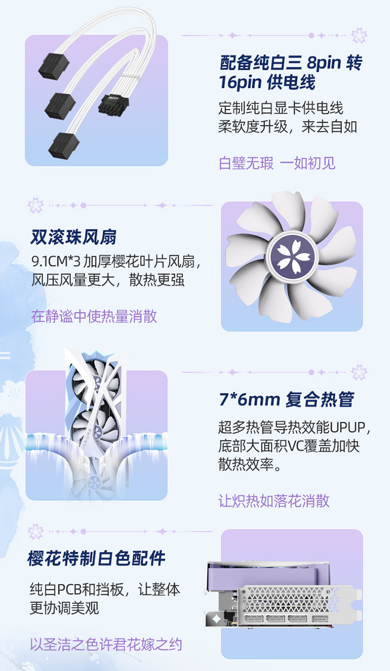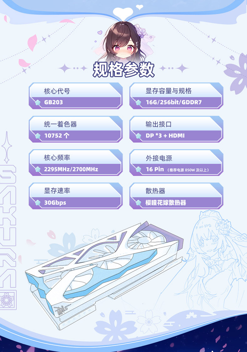 统一着色器:10752 个核心频率:2295MHz/2700MHz显存频率:1875 MHz显存速率:30Gbps显存容量与规格:16G/256bit/GDDR7Tensor Core (AI):1801 AI TOPS散热器:7*6mm 复合热管,VC 均热板,9.1cm*3 双滚珠风扇灯光:ARGB。默认彩虹灯效,灯光不可关闭风扇特性:6pin、可调速、可显示转速值、风扇启停总线接口:PCI-Express 5.0 x16输出接口: HDMI2.1b*1 ,DP2.1b*3最大分辨率:最高可支持 4K480Hz 12bit HDR。DP 8K165Hz,HDMI 8K120Hz。供电设计:10+4+3 相供电接口:16 Pin*1显卡功率/推荐电源: 约 360W/ATX 3.0 规范 850W 及以上显卡尺寸/重量:329*137*70mm/1582g(不含挡片耳朵)345*154*70mm (含挡片)