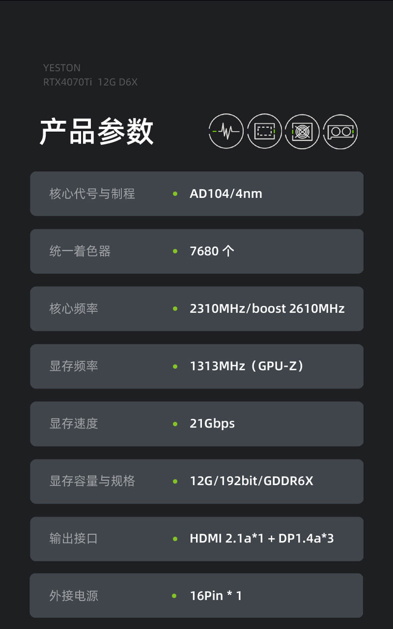 核心代号与制程: RTX4070Ti/5nm统一着色器:7680 个核心频率:2310MHz/boost 2610MHz 显存频率:1313MHz(GPU-Z) 显存速度: 21Gbps 显存容量与规格:12G/192bit/GDDR6X 3D 特性:DirectX 12/Ray Tracing/ Tensor/G-Sync /DLSS/ REFLEX/BROADCAST/ANSEL/ VRREADY/Vulkan1.3/ RT APIs/ OpenGL 4.6/HDCP 2.3,AV1 编解码OS 特性:WIN10/WIN11/LINUX(64 位)散热器:原厂(9cm 双滚珠风扇 *3, 6mm *8 热管,顶部字母等支持 argb 同步)风扇特性:可调速、可显示转速值总线接口:PCI-Express 4.0 x16输出接口: HDMI 2.1a*1 + DP1.4a*3最大分辨率:4K 240Hz1 (借助 DSC 技术),显示 7680 * 4320@60Hz HDR 效果