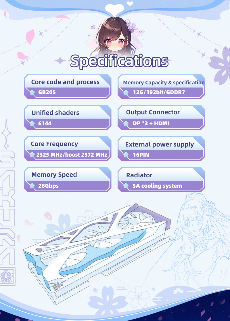 Core code: GB205Unified shaders: 6144Core frequency: 2325 MHz/boost 2572 MHzMemory frequency: 1750 MHzMemory speed: 28GbpsAI TOPS: 988Video memory capacity and specifications: 12G/192bit/GDDR7Radiator: YFST4A-Y (4*6mm heat pipe, 9.1cm double ball bearing and three fans)Bus interface: PCI-Express 5.0 x16Output interface: HDMI (2.1b*1) + DP (2.1b*3)External power supply: 16 PinGraphics card power/recommended power supply: ATX 3.0 specification 750W and aboveGraphics card size/weight: 328*137*64mm/1217gMaximum graphics card size: 342*153*64mm