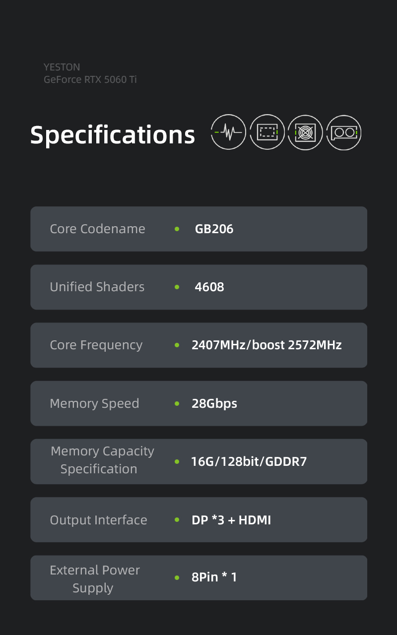Core code: GB206Unified shaders: 4608Core frequency: 2407 MHz/boost 2572 MHzMemory frequency: 1750 MHzMemory speed: 28GbpsAI TOPS: 759Video memory capacity and specifications: 16G/128bit/GDDR7Radiator: 2*9.6cm fan, 4*6mm heat pipeOutput interface: HDMI (2.1b*1) + DP (2.1b*3)Bus interface: PCI-Express 5.0 x8Power supply design: 5 NVVDD + 2 FBVDDExternal power supply: 8 PinGraphics card power/recommended power supply: about 180W/ATX 3.0 specification 600W and aboveGraphics card size/weight: 266*123*38mm(excluding bracket ) 790g Maximum graphics card size: 281*138*38mm (including blanks)